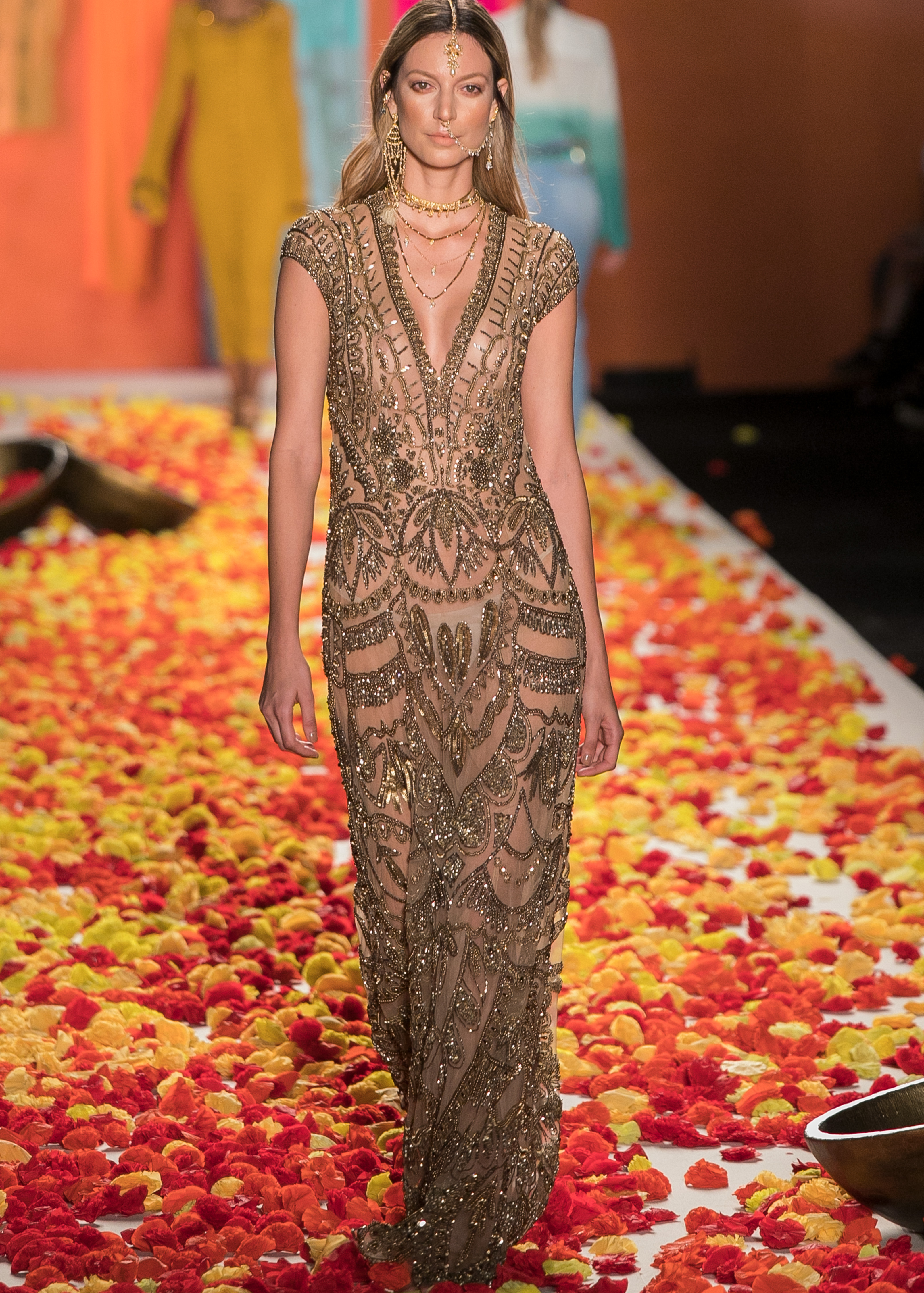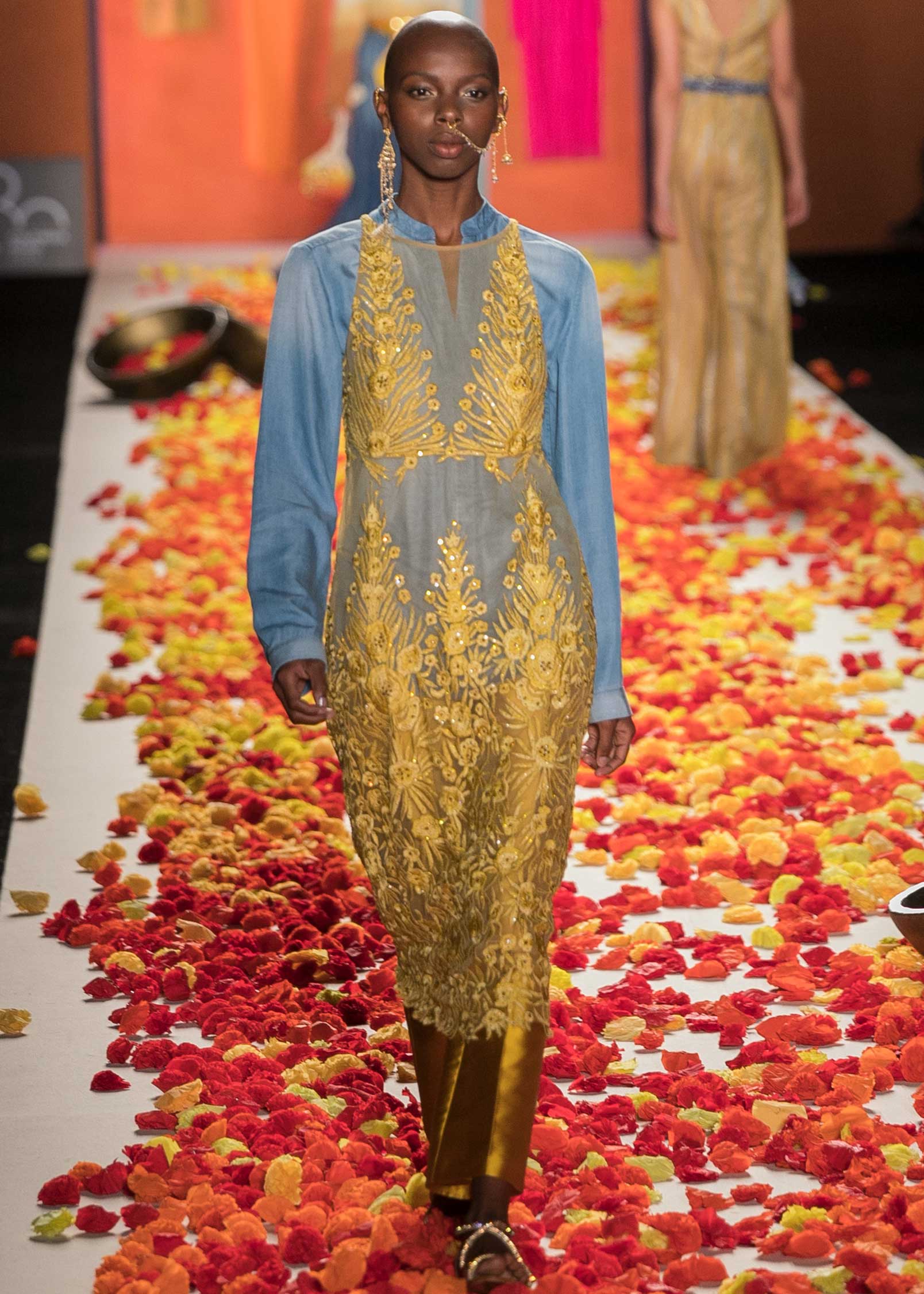 Fantástica Renata Lozano, salida tras salida dejó clara su trayectoria y su apuesta por el diseño de piezas contundentes, inteligentes y, definitivamente, versátiles al interior del ropero femenino.  En este caso presentó una colección que evidenció un alto componente de trabajo manual, piezas elaboradas al detalle, en las que predominó el brillo.  ¿Saben quienes eran los maharajás? en la India eran los regentes de más alto rango y solían vivir en medio de lujos y excentricidades y, por supuesto, su vestuario era suntuoso y vistoso.  Justamente, al ver esta colección, no pude evitar pensar en ellos; las sedas, los bordados y una paleta de color que asemejaba al arcoiris, me recordaron a estos nobles hindúes.  Diseños opulentos que tenían ciertos toques terrenales, como las camisas básicas de la firma, los jeans intervenidos, los blazers, las faldas amplias o los jumpsuits.  Combinaciones que resultaron atinadas, en otras palabras, el estilo de Renata Lozano en medio de la excentricidad oriental.  Hablemos de la música para estos looks, no es un asunto literal, pero sí una suerte de guiño…Las Grecas fue un dúo español, tocaban flamenco y rock, y si lo pensamos con calma, podrían ser las antecesoras de Rosalía.  El caso, es que para estos dos atuendos en particular suena Bella Kali, uno de sus hits. Así mismo, esa melodía con un sampler, por cuenta de Gonjasufi…sonidos un tanto experimentales y exóticos.
